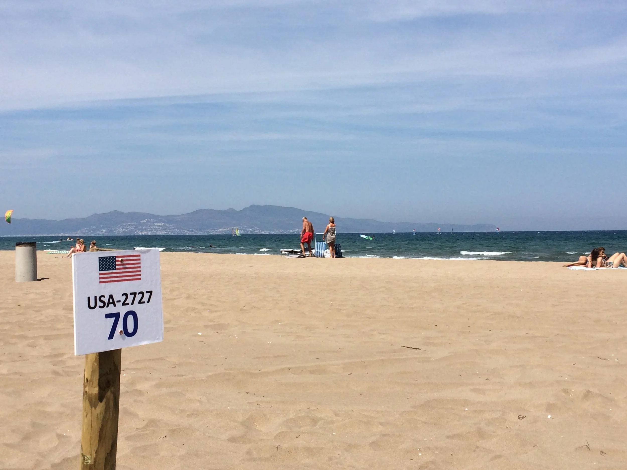 This is the designated spot for us to park our boat on the beach. Our assigned bow number for the races is 70. You can see that the wind is blowing pretty good across the Bay of Rosas in Spain about 100 miles north of Barcelona.