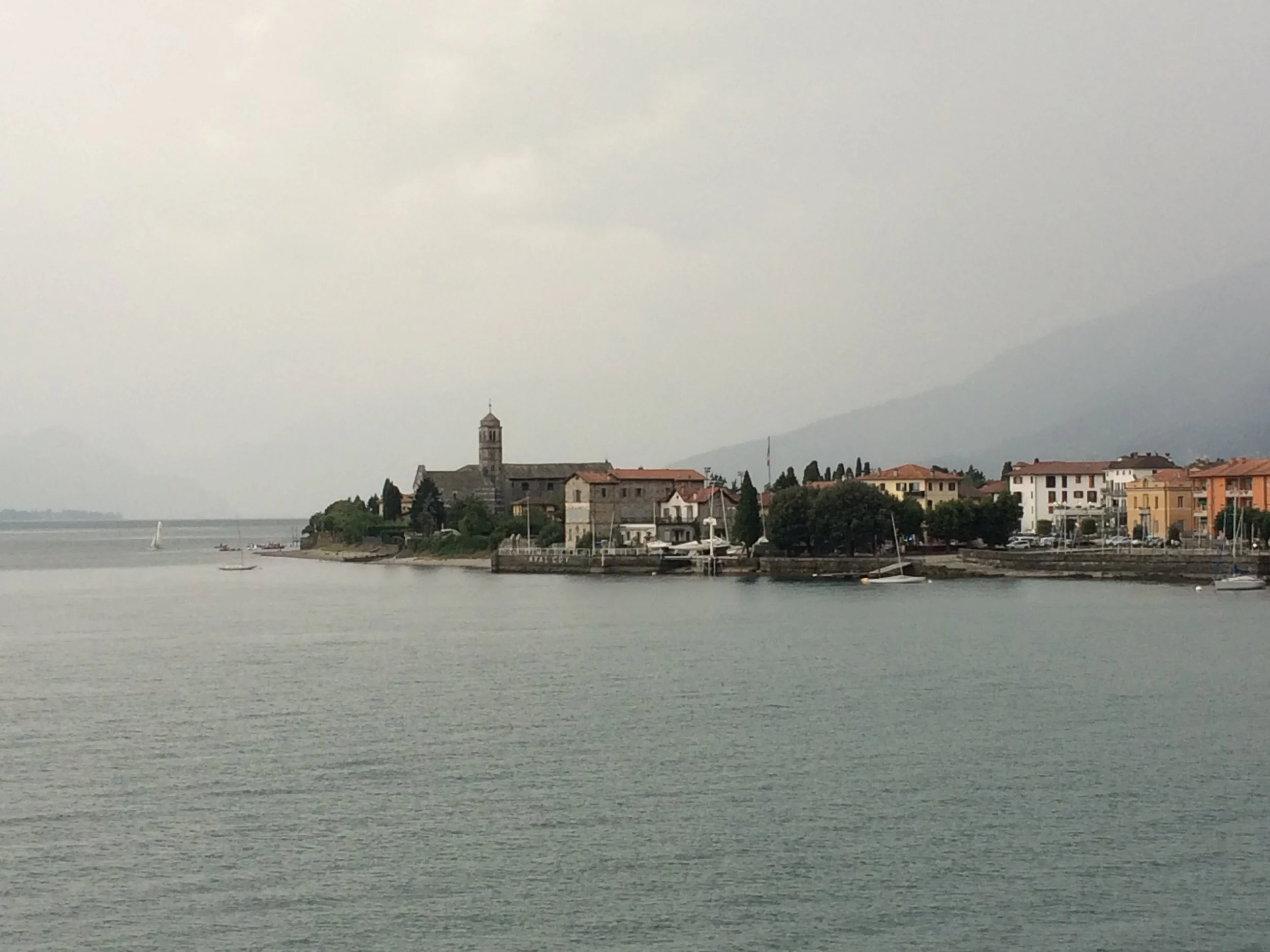 Gravedona, Lake Como, Italy. Our sailing club is just on the other side of the old church and you can see a catamaran heading out. It is a cute coastal town with several good restaurant within walking distance of the sailing venue.